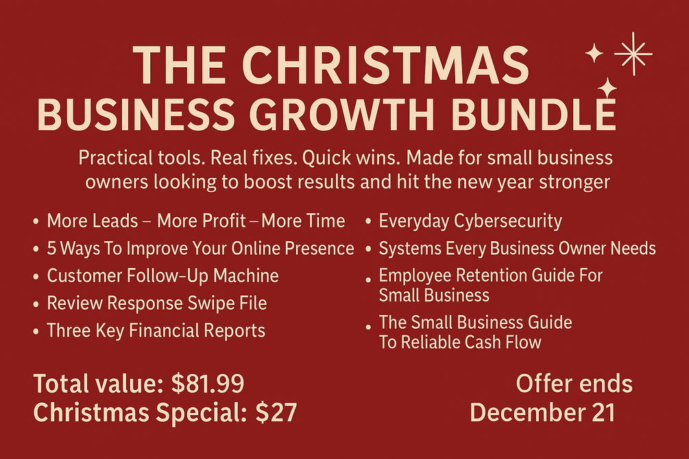 Running a small business is hard enough. Marketing. Cash flow. Reviews. Systems. Staff. Every day brings something new to deal with. This Christmas, I wanted to make things easier — not harder. So I pulled together ten of my most practical, easy-to-use guides into one simple bundle. Each one solves a real problem. Each one gives you something you can use the same day. You get tools for more leads. Tools for better follow-up. Tools for stronger cash flow. Tools for better reviews. Tools for protecting your business. Tools for keeping customers longer. Tools for making decisions with confidence. You don’t need more complexity. You need clear steps that make your business stronger. That’s why this bundle works. These guides normally sell for $81.99. But from December 14-21, you can get all ten for $27. This bundle will go away on Sunday night, December 21st. If you want simple, practical wins to make next year smoother, stronger, and more profitable - grab the bundle before the price jumps.